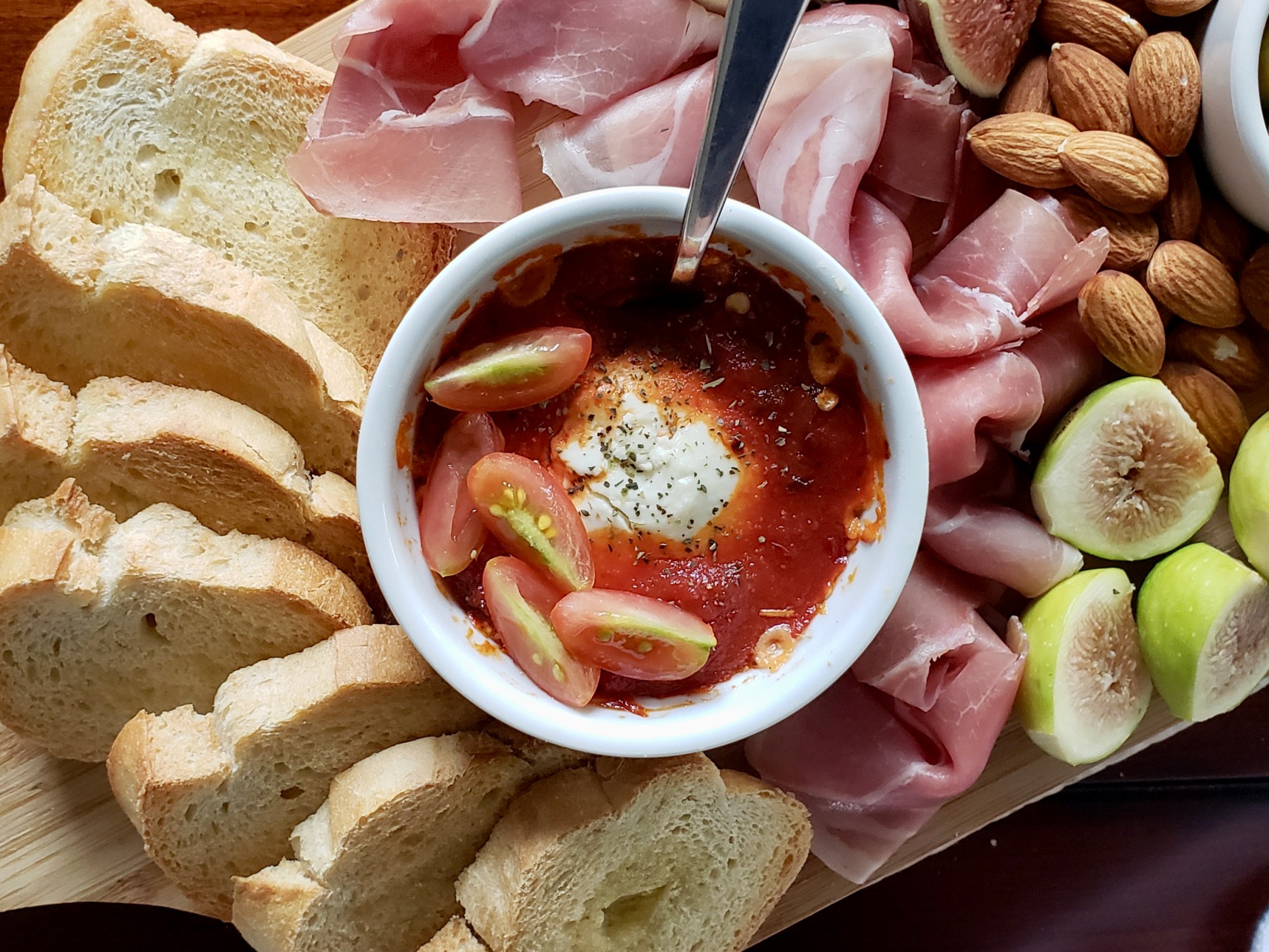 Evenly spread goat cheese into an oven-safe baking dish of choice. Top with marinara/pasta sauce and spices. Bake at 375 degrees fahrenheit until the goat cheese is soft and the sauce is bubbly (baking time will depend on how large of a dish you’re making).